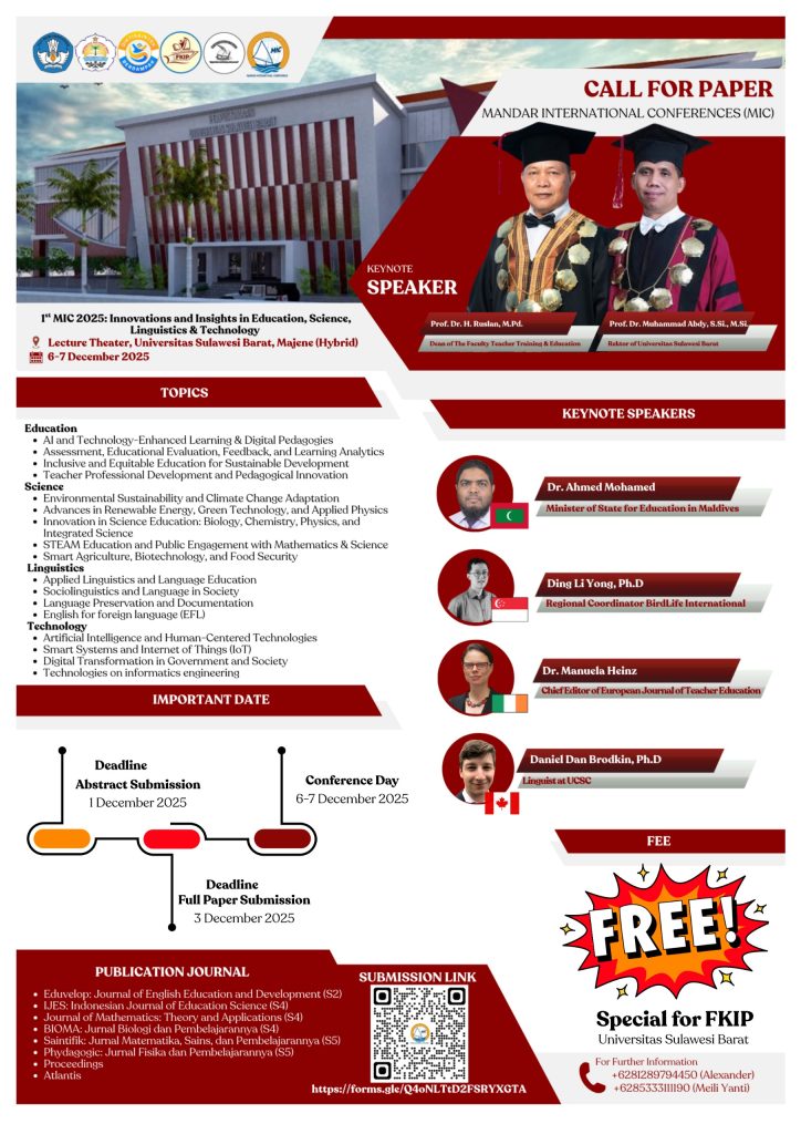 As a strategic initiative to strengthen scholarly collaboration and expand interdisciplinary academic networks, the Research and Community Service Unit of the Faculty of Teacher Training and Education (FKIP), Universitas Sulawesi Barat, proudly announces the inaugural Mandar International Conference.