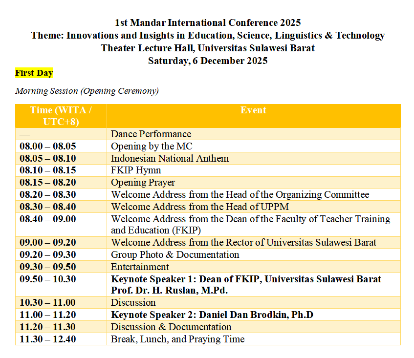 Below is the official schedule and venue allocation for all presenters of the 1st Mandar International Conference. This table includes the presentation sequence, room assignments, and time slots for each session.